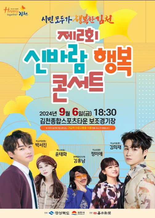 김천시(시장 김충섭)는 「제2회 신바람 행복 콘서트」를 2024. 9. 6.(금) 18:30, 김천종합스포츠타운 보조경기장에서 개최한다고 밝혔다.