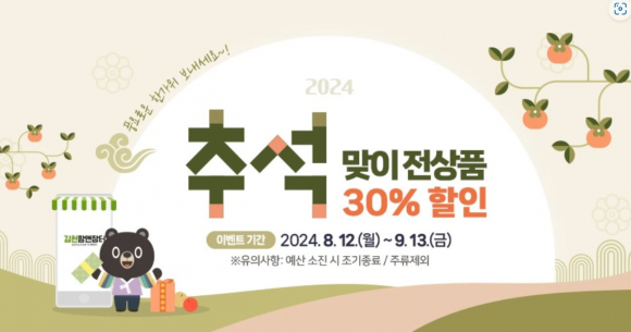 김천시는 이번 추석을 맞이하여, 김천시 대표 농특산물 쇼핑몰인 ‘김천팜앤장터’에서 2024년 8월 12일부터 9월 13일까지 전 상품 할인행사를 진행한다.