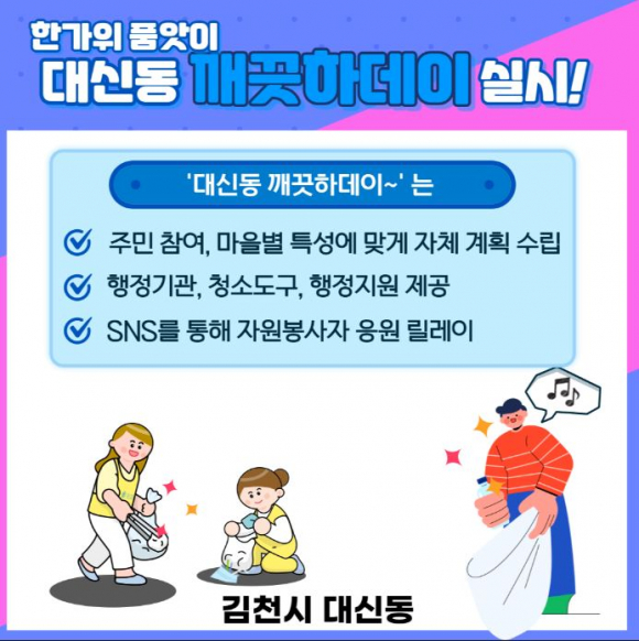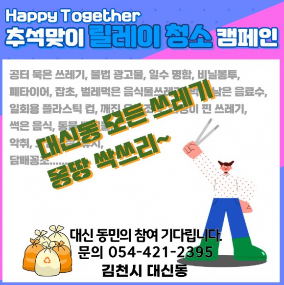 김천시 대신동(동장 이해정)은 다가오는 추석 명절을 맞아 깨끗하고 쾌적한 마을 환경 조성을 위해 '추석맞이 릴레이 청소 캠페인 (대신동 깨끗하데이~)'를 실시한다.
