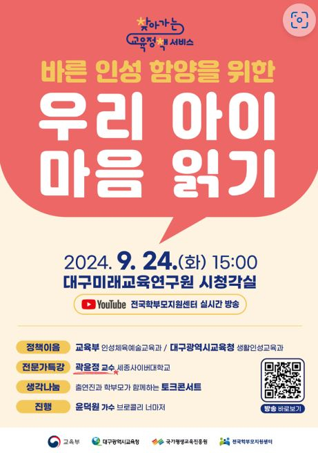 이어, 대구시교육청 이해연 과장, 교육부 김새봄 과장, 곽윤정 교수와 학부모가 함께하는 토크콘서트를 통해 부모님들이 자녀의 마음을 더 깊이 이해하고 학교와 함께 자녀를 올바른 방향으로 양육하기 위한 고민과 구체적인 해결방안에 대한 소통의 시간을 가진다.