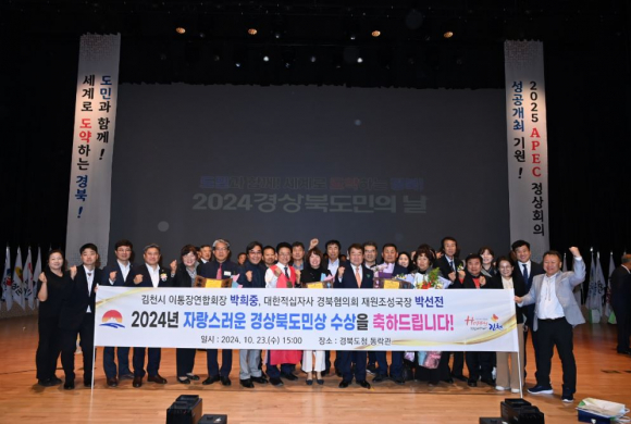 김천시는 지난 23일 경북도청 동락관에서 열린 ‘2024 경상북도민의 날’ 행사에서 박희중 김천시이통장연합회장과 박선전 대한적십자사 경북지사 재원조성국장이‘자랑스러운 경상북도민상’을 수상했다고 밝혔다.
