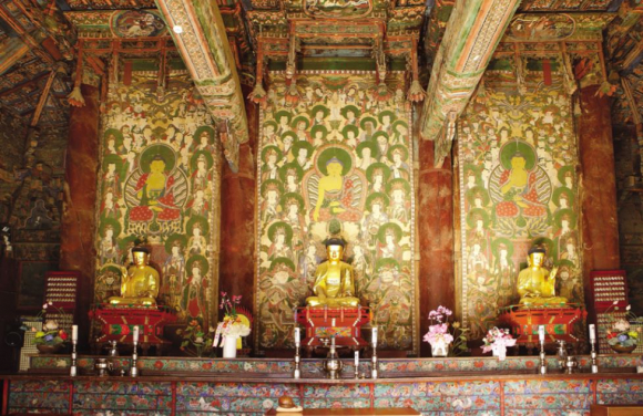 ‘김천 직지사 석가여래삼불회도’는 조선 후기 후불도로, 현존하는 삼불회도 중 3폭이 온전하게 남아 있는 가장 오래되고 규모가 큰 작품으로 1980년 보물로 지정됐다가 이번에 국보로 지정 예고됐다. 이 작품은 조선 후기에 유행한 공간적 삼불회도의 전형으로 평가받는 불화로, 장대한 크기에 수많은 등장인물을 섬세하고 유려한 필치로 장중하게 그려냈다.