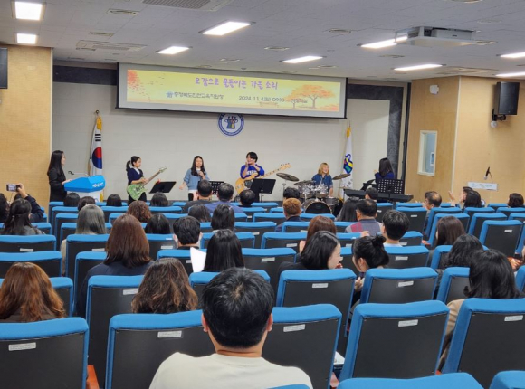 특히, 이번 직장교육은 자발적으로 구성된‘진천삼수초등학교 다원밴드’와 진천 출신 성악가 소프라노 전은정님이 오감으로 물들이는 가을 소리라는 연주회를 시작하면서 진행되었다. 깊어가는 가을 초등학생들로 구성된다원밴드의 신나는 음악은 어린 시절의 향수를, 소프라노 전은정님의 독창은 월례조회에 참석한 많은 직원들에게 소중한 가을을 선사하였다.