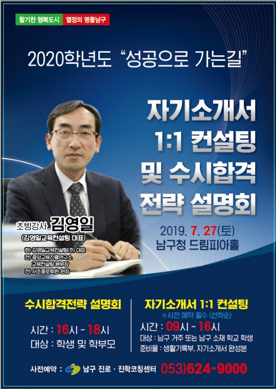 이번 입시설명회는 김영일교육컨설팅(주) 김영일 대표와 진학상담 강사가 2020학년도 수능기본계획에 맞춰 맞춤형 진학정보와 수시 대비 자기소개서 1:1 컨설팅을 제공할 계획이다.