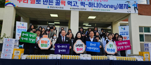 창녕교육지원청(교육장 이경희)과 NH농협 창녕군지부(지부장 최정권)는 11월 5일(화) 창녕여자고등학교에서 우리 쌀 소비 촉진 및 창녕의 고3 수험생 격려를 위해 꿀백설기와 식혜를 나누어주는 행사를 가졌다. 이번 행사는 창녕 관내 고등학교 3학년 전체(460여 명)를 대상으로 창녕 쌀로 만든 꿀백설기와 식혜를 나눠 주면서 범국민 아침밥 먹기 캠페인 홍보 및 대학수학능력시험을 앞둔 수험생을 격려하기 위해 추진되었다. 이날 창녕여고 박형진 교장은 “창녕여자고등학교를 방문하여 학생들을 응원 해주심에 감사드리며, 창녕 관내 수험생들 모두가 좋은 기운을 받아 그동안 쌓아온 노력과 열정이 좋은 결실을 맺을 수 있기를 기원한다.”라고 전했다. 또한, 최정권 NH농협 창녕군지부장은“이번 행사로 우리 쌀 소비 촉진과 더불어 창녕의 고등학교 3학년 학생들이 원하는 학교에 떡-하니 붙는 좋은 결과가 있기를 바란다.”며 수험생들에게 응원의 메시지를 전달 했다. 이날 이경희 교육장은 “창녕의 고3 수험생들이 창녕 쌀로 만든 떡을 에너지원으로 다가오는 수능에 자신감을 가지고 임하여 학생들의 노력이 꼭 좋은 결과로 이어지기를 진심으로 바란다.”라고 전했다. |