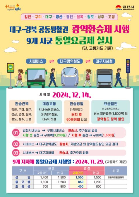 11월 29일부터는 김천시를 포함한 9개 지자체에 통일된 교통카드 요금제 가 적용됩니다. 교통카드 기준으로 성인 1,500원, 중고생 850원, 초등생 400원의 요금 체계가 도입되어, 지역 간 요금 차이로 인한 불편이 해소되 고, 대중교통 이용 부담이 줄어들 것으로 기대됩니다.