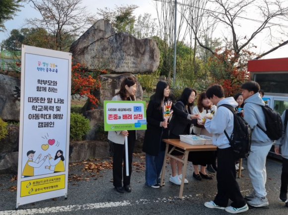 충남도공주교육지원청(교육장 구기남)은 11월 4일과 5일 이틀간 관내 중학교 1개교와 초등학교 3개교에서 학부모와 함께하는 따뜻한 말 나눔 학교폭력 및 아동학대예방 캠페인을 실시했다.