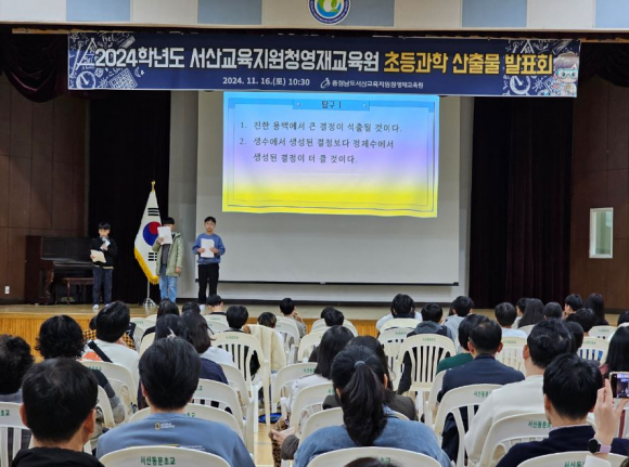 서산교육지원청영재교육원(원장 성기동)은 2024년 11월 9일~11월 23일까지 3주간 각 과정별 창의적 산출물 나눔마당을 운영하고 있다. 지난 11월 16일(토)에는 서산동문초등학교 도담관에서 초등과학과정 산출물 나눔의 시간을 가졌다. 이는 초등과학팀 학생들이 각 지도 교사들과 함께 연구한 과정 및 결과를 함께 나누는 시간으로, 과학자들의 탐구 과정을 내재화하여 실제 실험 설계 및 변인 통제 과정을 체험하기 위함이다.