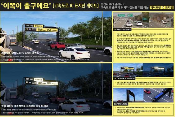 □ 대학부 대상(국토부장관상)은 고속도로 출구의 위치와 안내 정보를 더 쉽게 전달시켜 사고를 줄일 수 있는 ’고속도로 IC 표지판 게이트‘이며, 일반부 대상(국토부장관상)은 지하고속도로 벽면에 창문형 디스플레이를 설치해 이용자에게 개방감을 주어 피로감을 줄이고 다양한 교통안전 정보를 제공하는 ’창문 너머의 풍경을 빛으로 열다‘가 수상했다. ㅇ 이 밖에 고속버스 이용 시 휴게소 주차 위치와 출발시간을 디스플레이를 통해 실시간 안내하는 ’기사님 잠시만요!‘ 등 우수한 아이디어들이 선정됐다.
