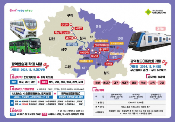 경산시(시장 조현일)는 대중교통 이용 활성화와 대구-경북 공동생활권 지자체 시민들의 교통비 절감을 위해 대구권 광역철도(대경선) 개통 시기인 2024년 12월 14일에 맞춰 대중교통 환승 서비스 지역을 확대한다.